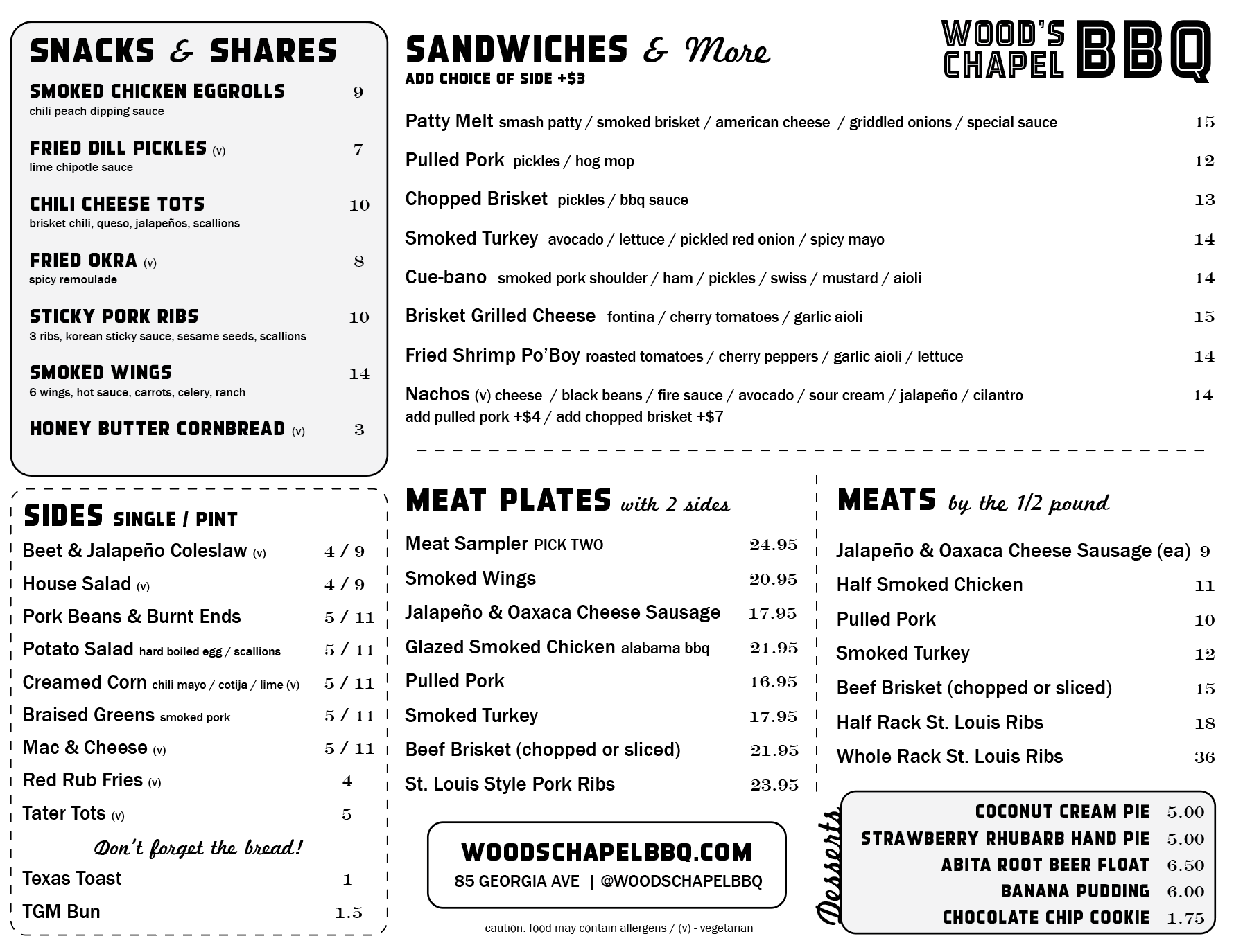 Named for one of the first churches to serve the Summerhill community immediately following the Civil War, Wood's Chapel BBQ uses traditional wood-fired pits to prepare an extensive barbecue menu including whole hog, prime brisket, salmon, and turkey.
